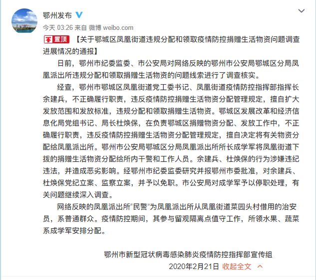 2月22日凌晨,湖北省鄂州市政府新闻办公室官方微博 @鄂州发布 通报了关于鄂城区凤凰街道违规分配和领取疫情防控捐赠生活物资问题调查进展情况。