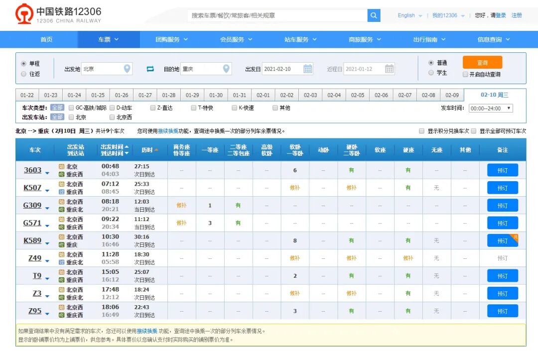 2021年除夕火车票今日(13日)开售!你要回家过年吗?今年春运有些不同,需要注意以下几点。注意一:往返售票日期要牢记根据放假安排,2021年春节假期时间为2月11日(除夕)至17日(初六)。按照火车票互联网和电话订票提前30天发售的规定,今日起,旅客可以通过网络和电话购买2月11日(除夕)火车票。返程方面,2021年2月16日(正月初五)的火车票将在1月18日开售;2月17日(正月初六)的火车票将于1月19日开售;此外,元宵节(2月26日)的火车票将于1月28日开售。注意二:多条铁路河北各站停售进京车票铁路12306官网提示,在进京列车停靠的河北省各站点,进京旅客进站乘车时须提供72小时以内核酸阴性检测证明。自1月9日0时起,旅客办理1月8日24时前已购河北省内各站前往北京地区各站的有效车票退票时,均不收取退票手续费。 12306网站提示。来源:12306网站截图根据国务院联防联控机制和各地方政府疫情防控有关要求,铁路部门针对部分区段采取限制购票措施,广大旅客可通过12306官网“查询车票”功能了解允许购票区段。 据12306语音客服介绍,自1月9日零时起,京沪、京沪高铁、京九、京广、京广高铁、京原线河北省内各站暂停发售前往北京地区各站车票。石家庄、邢台地区各站暂停发售前往全国各站车票。注意三:部分热门线路购票没往年紧张根据往年惯例,目前已进入春运抢票的高峰期,但受疫情影响,多地倡议就地过节。此外,部分地区还明确,春节假期从低风险区返乡者需持核酸检测阴性证明。在此背景下,今年春运购票的激烈程度与往年相比,明显缓和。记者12日查询2月10日(腊月二十九)的火车票发现,当天多条线路余票充足。其中,北京到重庆的9个车次中,除Z49的车票售罄外,其余8个车次均有余票;北京到广州的7个车次中,Z35、G67、G69三个车次也都有余票;北京到贵阳的9个车次中,K507、Z149、G401等7个车次均有余票。2月10日北京到重庆各车次余票情况。来源:12306网站截图当然也有部分路线车票较紧张。例如,北京到长沙的25个车次中,仅K635、G503、G505、Z1四个车次还有余票,其余车次均处于“候补”状态;北京到济南的97个车次中,仅K285、G331、G21、G333、G341、G337、K411 7个车次还有余票,其余91个车次车票都已售罄。注意四:没票别慌还可“捡漏”没有买到火车票的旅客,可使用12306网站和App中的“候补购票服务”功能,一位旅客可预约两个相邻日期的4张车票进行候补购票。此外,在以下时间节点尝试购票,也有望“捡漏”成功:车票开售30分钟后,如有旅客未及时付款,车票会重新返回系统发售;开车前15天,是退票高峰期;开车前48小时和24小时,系统会放出部分剩余车票;一般22点到23点是退票高峰;每个停靠车站有一定比例的分配票额,如有未售完的票,开车前一天余票将再次出售。特别提醒大家的是,12306官网购票是最有保障的选择,切勿轻信第三方抢票软件,以免上当受骗。注意五:不同车站网上起售时间不一致根据去哪儿火车票预约趋势,2021年春运去程首个出行高峰将出现在2月1日,而2月2日至4日期间出行人数相对较少。从旅客预约车次的出发时间来看,去哪儿发现早晨8至9时为全天出行最集中的时间段,其次是9至10时。而凌晨3至6时则为全天出行量最低时段。值得注意的是,今年铁路12306网站售票服务时间延长,从每日的6:00至23:30,提前到每日5:00至23:30。此外,不同火车站火车票网上起售时间并不相同。以北京为例:北京西站上午8点起售,北京站上午10点起售,北京北站中午12点起售,北京南站中午12点30分起售,清河站下午4点起售。所以大家记得根据自己出发的火车站提前订好闹钟,以免错过购票时间。注意六:多地要求返乡者持核酸检测阴性证明因国内多地出现新增病例,北京、天津、上海、重庆、河北等多地倡议就地过节。还有多地明确,春节假期返乡者需持核酸检测阴性证明。河南省焦作市修武县委督查室1月8日表示,我们倡议非必要不返乡,如确需返乡,要携带近7日内核酸检测证明并提前2天向所在村、社区报备,返乡途中要全程佩戴口罩。武汉市新冠肺炎疫情防控指挥部1月10日发布通知,即日起,全国低风险地区返汉过春节的人员,全部要持7天内核酸检测阴性证明,体温正常且持绿码和通信行程卡,可以通行。吉林市卫生健康委员会11日发布公告,凡是从外省返乡进村人员必须持有3日内核酸检测阴性证明或能够出示包含3日内核酸检测阴性信息的健康通行码,在体温正常且做好个人防护的情况下方可自由通行;没有核酸检测报告的实行“落地即检”,检测结果为阴性、体温正常且在做好个人防护的情况下,方可自由有序流动。注意七:做好防护健康出行近日,文化和旅游部市场管理司司长刘克智提醒广大民众,春节期间要合理安排行程,减少不必要的出行,非必要不安排出境旅游,不要前往国内中高风险地区旅游。一是加强防护,健康出游;二是避免扎堆,错峰出游;三是要加强防范,平安出游;四是遵守秩序,文明出游。国铁集团客运部副主任朱文忠同时表示,希望广大旅客积极配合和支持铁路部门,加强个人健康防护,落实好各项防控措施,共同营造安全、健康的旅行环境。一是配合车站做好进出站测温工作;对有发热症状的,自觉接受地方防控部门的排查。二是进站、乘车全程佩戴口罩,咳嗽、打喷嚏应注意遮挡。三是在车站候车时,保持安全距离,尽量减少人员聚集。乘车中,对号就座,减少车上走